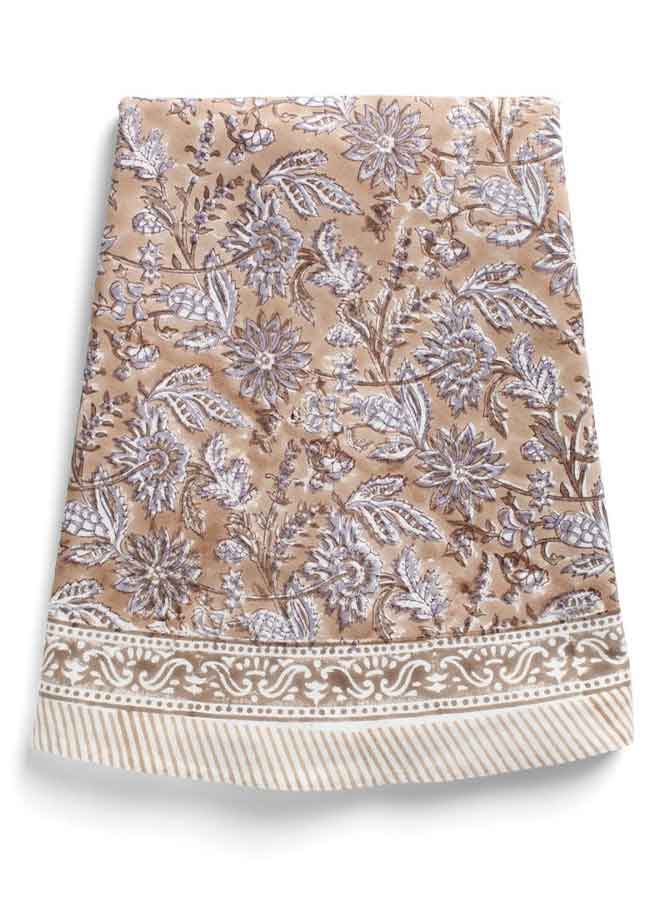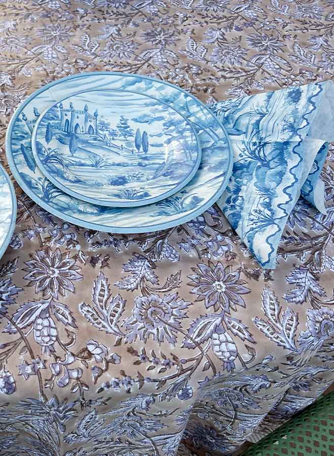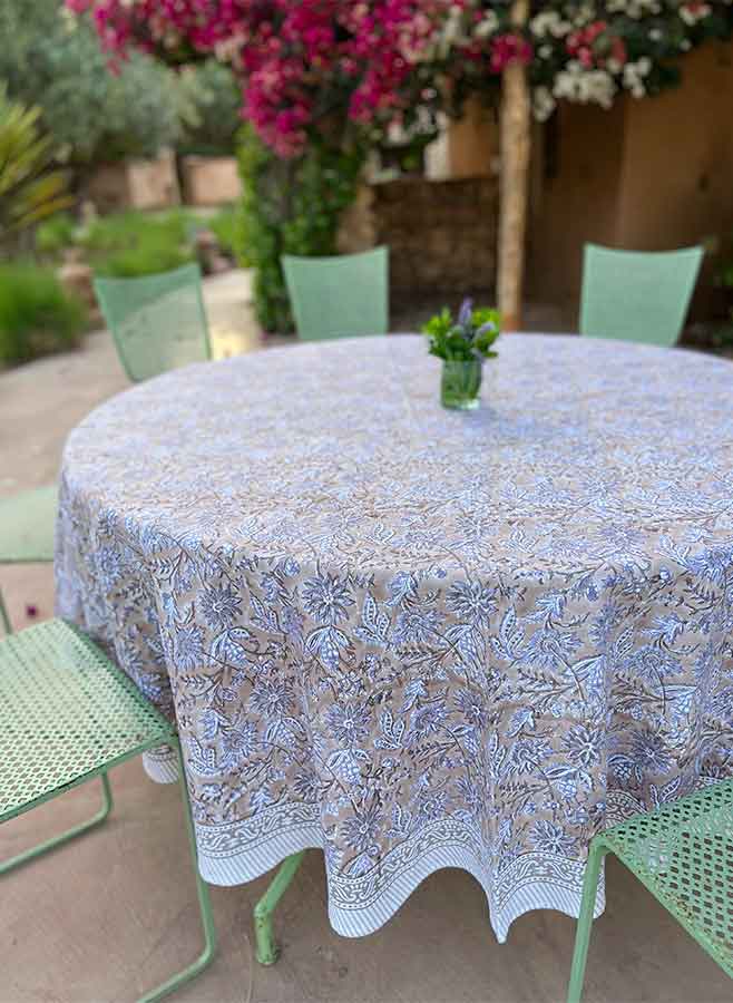 Magiskt vacker rund bordsduk från Chamois med medelstort blomstermönster och bård längs kanterna. Duka fint på det runda bordet denna klassiska duk som är tidlös och smakfull till alla tillfällen och fin till alla sammanhang. Duka vackert till midsommar, i trädgården och i hemmet. Duken är handtryckt med traditionell träblocktrycksteknik.