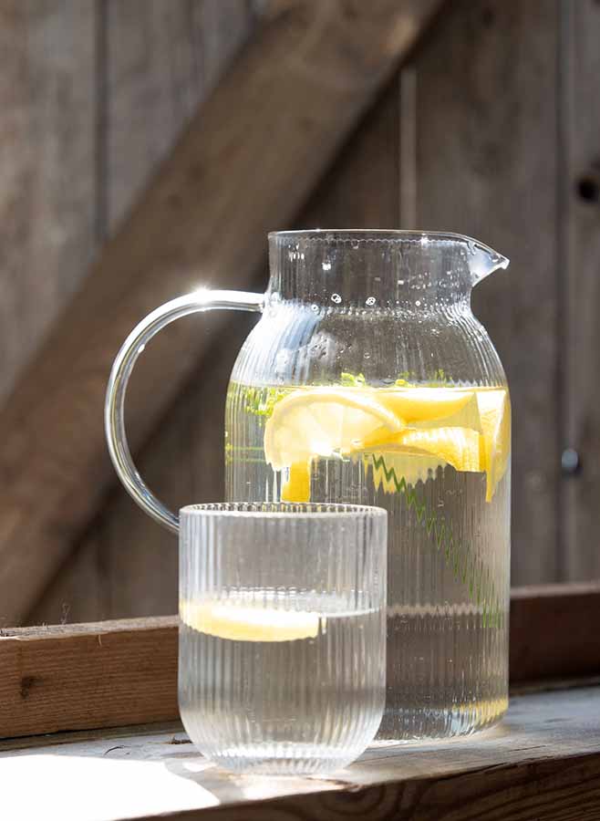 Karaffen är perfekt för vatten, juice eller andra drycker och fungerar även som en dekorativ vas för snittblommor. En mångsidig inredningsdetalj som ger dukningen ett genomtänkt och harmoniskt uttryck.