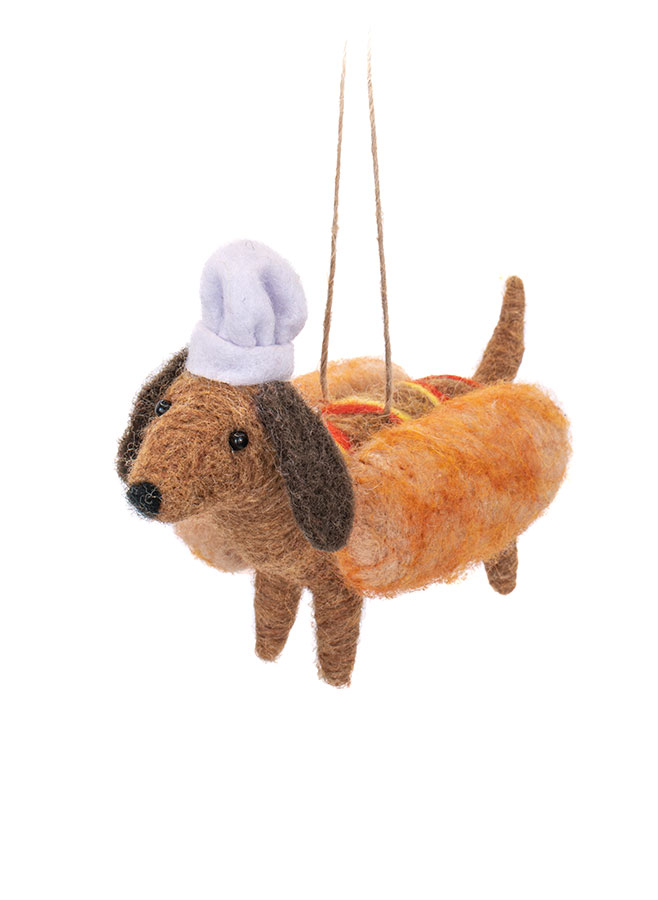 Ge din julgran en lekfull och personlig touch med vår otroligt söta tax julgransdekoration i filt. Den charmiga prydnaden föreställer en Hot dog tax med kockmössa (en riktig Hot dog) Denna julgransdekoration är perfekt för hundälskare och ett roligt tillskott till julfirandet.