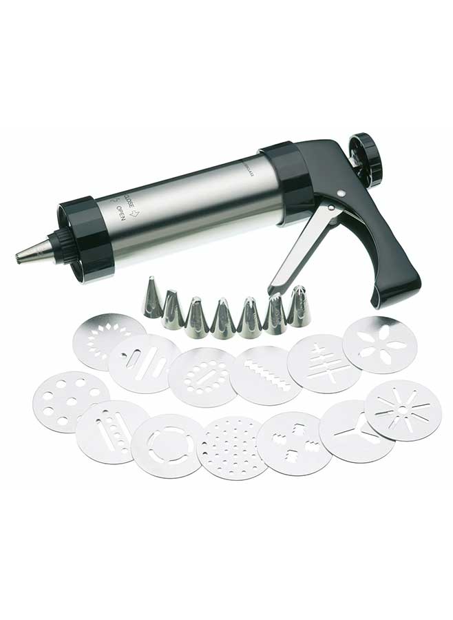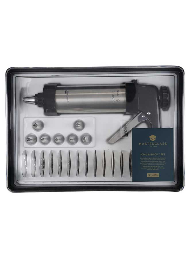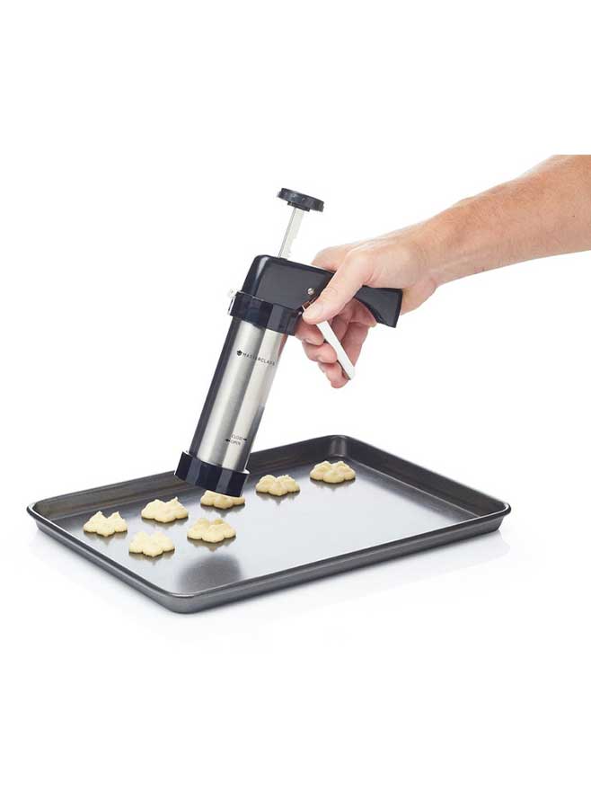 Skapa professionella kex och tårtdekorationer hemma med detta kompletta 22-delars set med glasyrpistol och kakpress från MasterClass. Setet är designat för att ge dig samma precision och kreativitet som ett bageri, oavsett om du är nybörjare, hemmabagare eller professionell konditor.