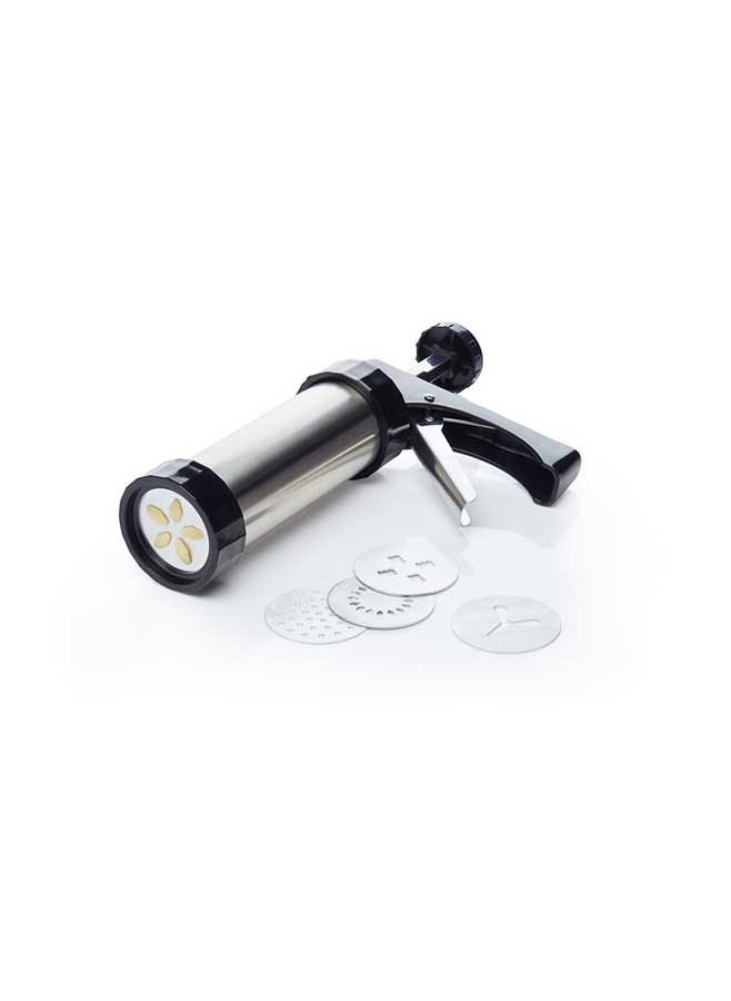 Glasyrpistolen är tillverkad i slitstarkt rostfritt stål med robusta plastkomponenter som ger lång hållbarhet och stabil användning. Munstycken och kakformar är också i rostfritt stål för hög precision och hygienisk bakning. Den ergonomiska designen gör verktyget bekvämt att använda även vid större bakprojekt.