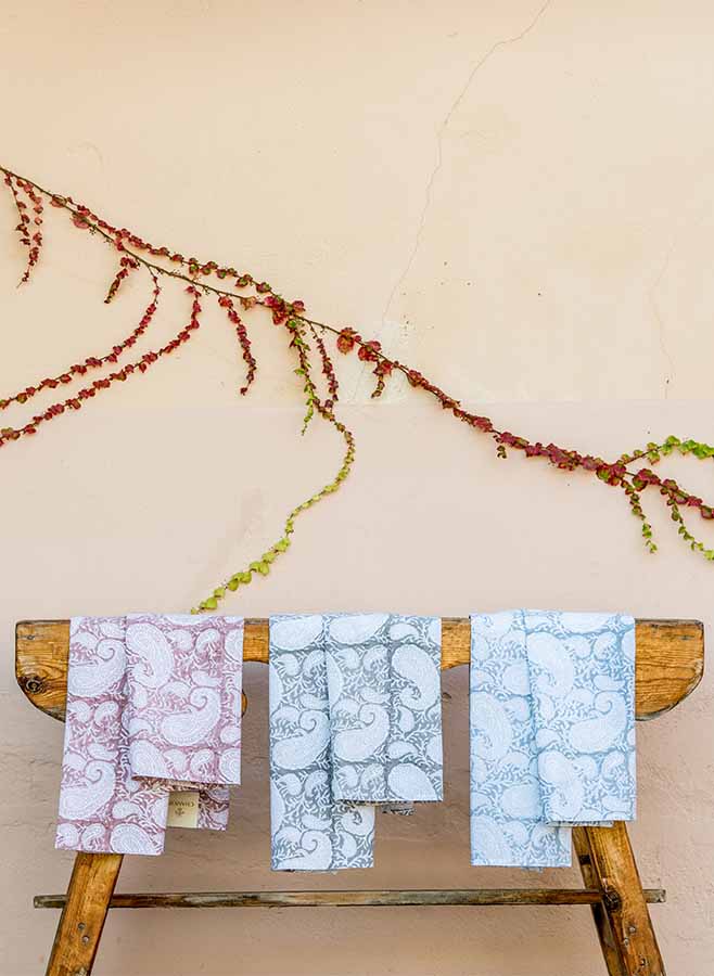 Kökshandduken Big Paisley Fuchsia Rose från Chamois kombinerar funktion och skönhet på bästa sätt. Tryckt för hand med traditionell träblocksteknik pryds den av det dekorativa mönstret i en mjuk rosa ton – en lugn och tidlös färg som lyfter köket med sin diskreta elegans.