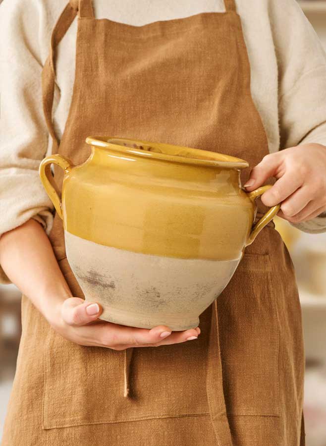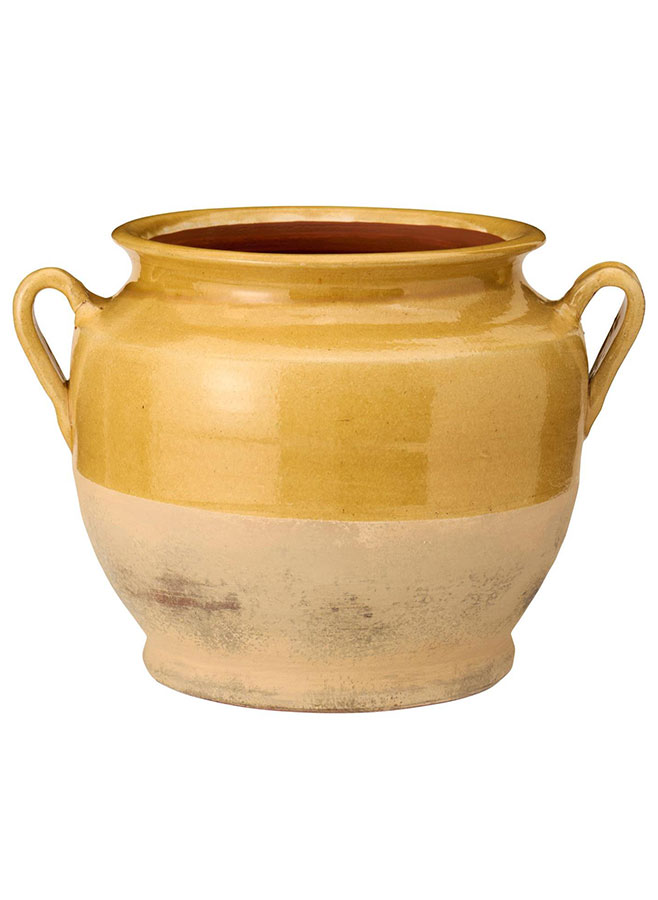 Lerkrus med öron i gul glasyr Avignon är en dekorativ och rustik kruka i keramik som kombinerar hantverkskänsla med tidlös design. Den varma gula löpande glasuren ger ett levande och konstnärligt uttryck som gör varje exemplar unikt och skapar en mjuk, inbjudande känsla i hemmet.