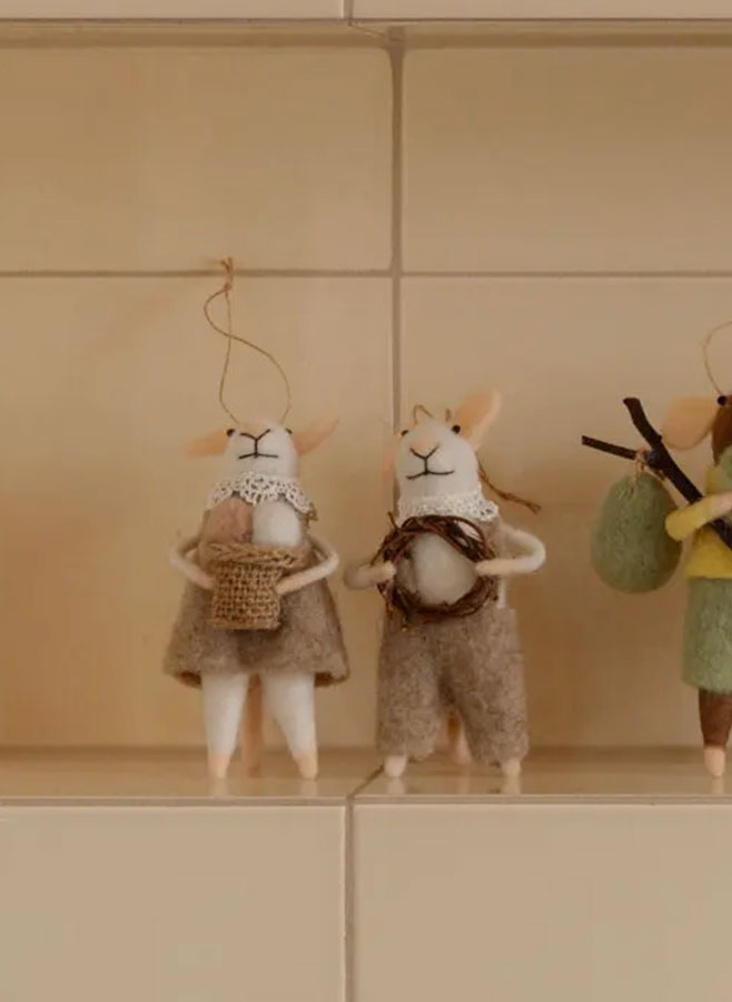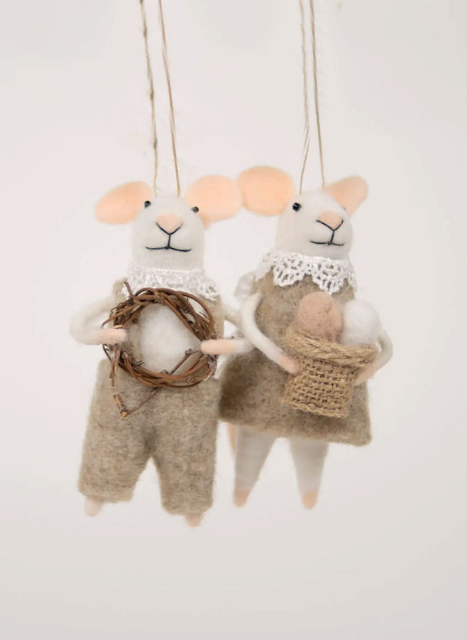 Skapa en inbjudande och tidlös atmosfär med Möss i ull med vit krans och påskägg i påskriset.