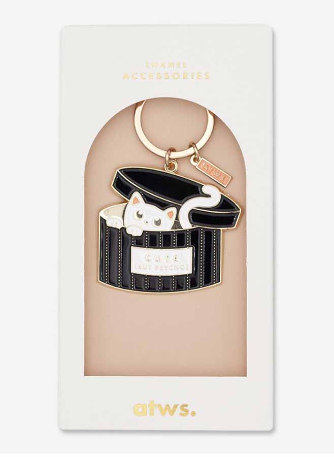 Ge dina nycklar en kaxig tvist med nyckelringen ”Cute but Psycho”. Med sin finish i guldpläterad emalj kombinerar denna lekfulla accessoar attityd med stil. Perfekt för att ge dina nycklar eller din väska ett uttrycksfullt lyft!