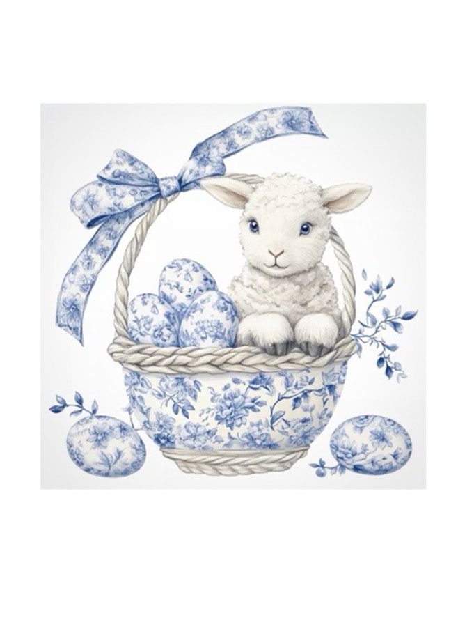 Skapa en stämningsfull och klassisk påskdukning med denna vackra påskservett med motiv av ett lamm i korg omgiven av blå påskägg. Ett tidlöst och charmigt motiv som passar lika bra till påsklunchen, påskmiddagen eller vårens alla festliga tillfällen.