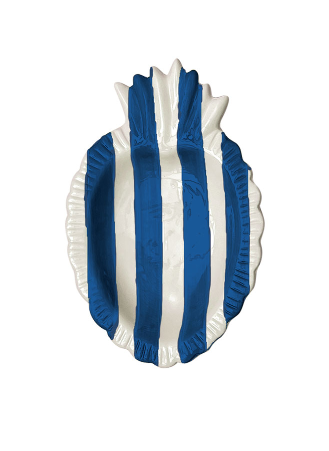 Denna småskål i keramik erbjuder både praktisk användning och dekorativ charm – använd den för servering av små tilltugg, oliver, nötter eller bara som en elegant detalj på ett sidobord eller köksbänk. Dess klassiska och ändå lekfulla randiga mönster gör att den passar lika bra tillsammans med andra porslinsdetaljer som som fristående blickfång.